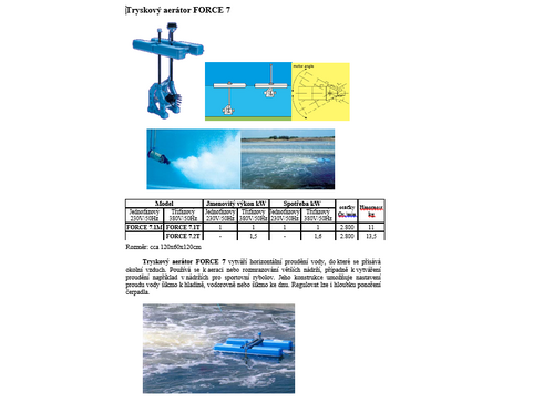 Aerátor tryskový FORCE se používá v rybářství k provzdušňování vody. Trysk provzdušněné vody lze nasměrovat požadovaným směrem (i nahoru či dolů). Tím lze využít i k rozmrazování vodní hladiny na rybníku.