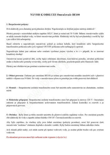 • Zařízení pro omráčení BE100 je určeno pro omračování menšího množství ryb v plastové nádrži o objemu cca 50 litrů.