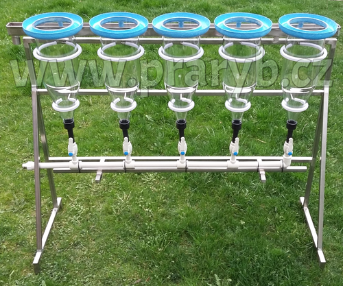 Kompletní stojan se 7 ks zugských láhví s objemem 10 litrů je vyroben z nerezové oceli. Plastové trubky pro přívod vody k jednotlivým lahvím jsou opatřeny ventily pro seřízení průtoku vody. Napojení přítoku vody do láhví je pomocí gumových spojek. Odpad vody z láhví je přes sběrné laminátové límce, ze kterých je přepad do sběrného kanálku.