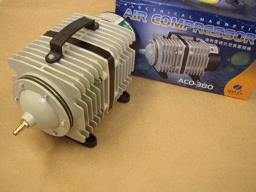 Vzduchovací univerzální bezolejový elektromagnetický pístový kompresor na 230 V pro stálý provoz. (Píst kmitá mezi dvěma magnety). Připojením přes měnič napětí z elektrického rozvodu vozidla lze kompresor využít k mobilnímu zajištění zdroje vzduchu při přepravě ryb.